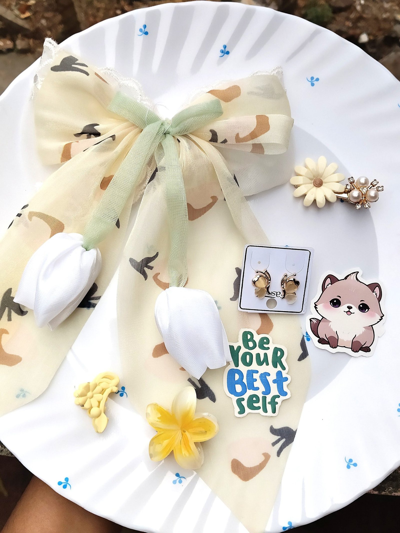 7Items: Bow, Korean Earring, Korean Pin, Clips 2, Stickers 2