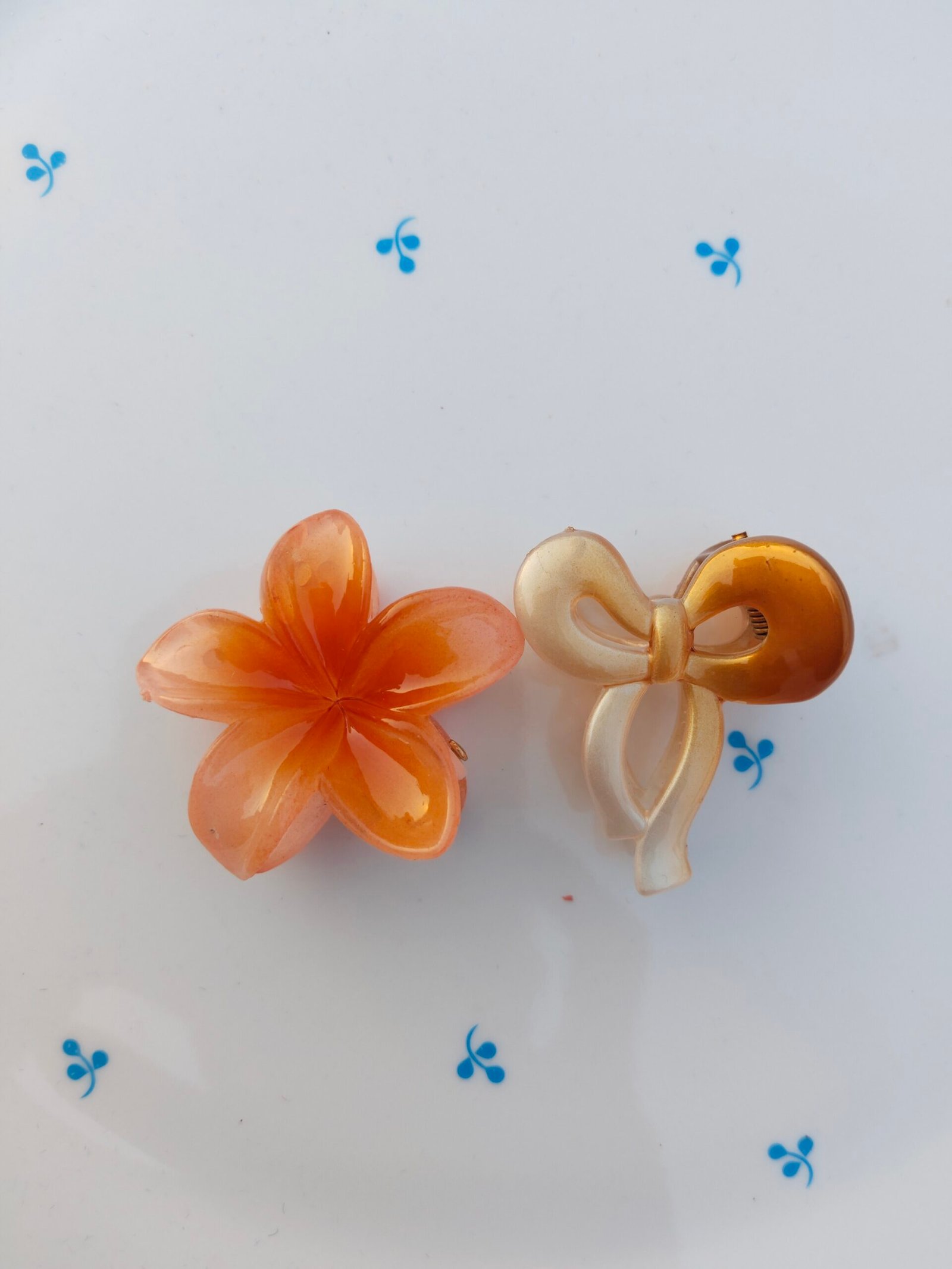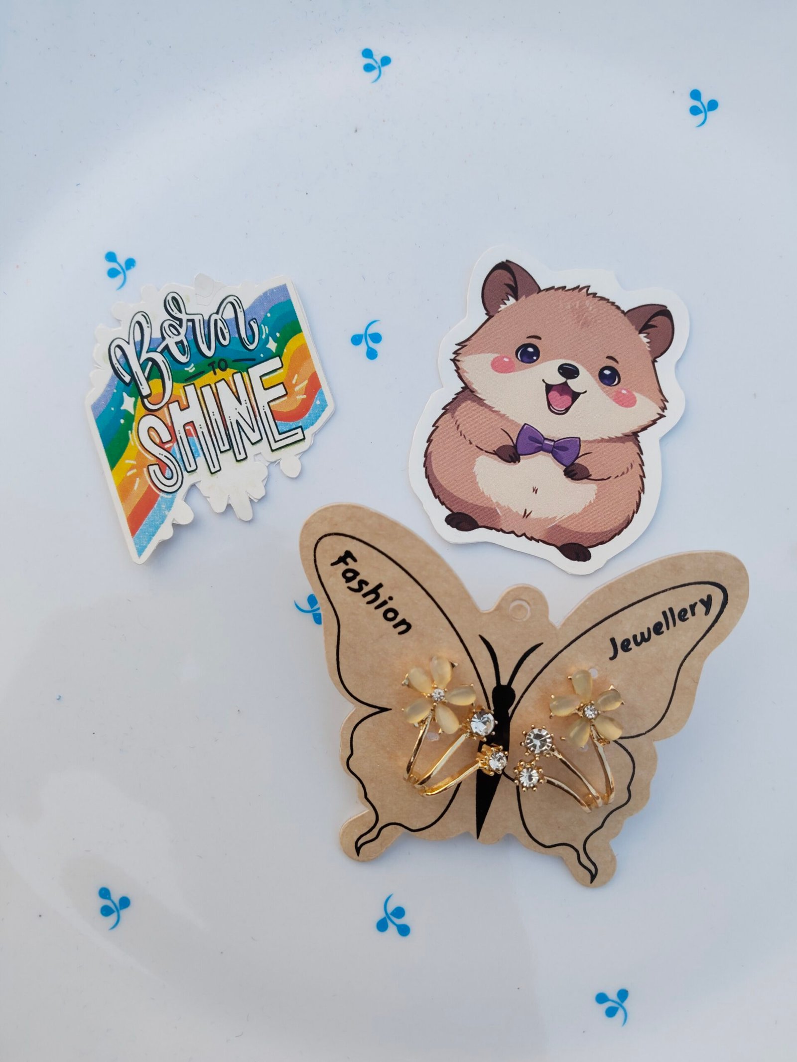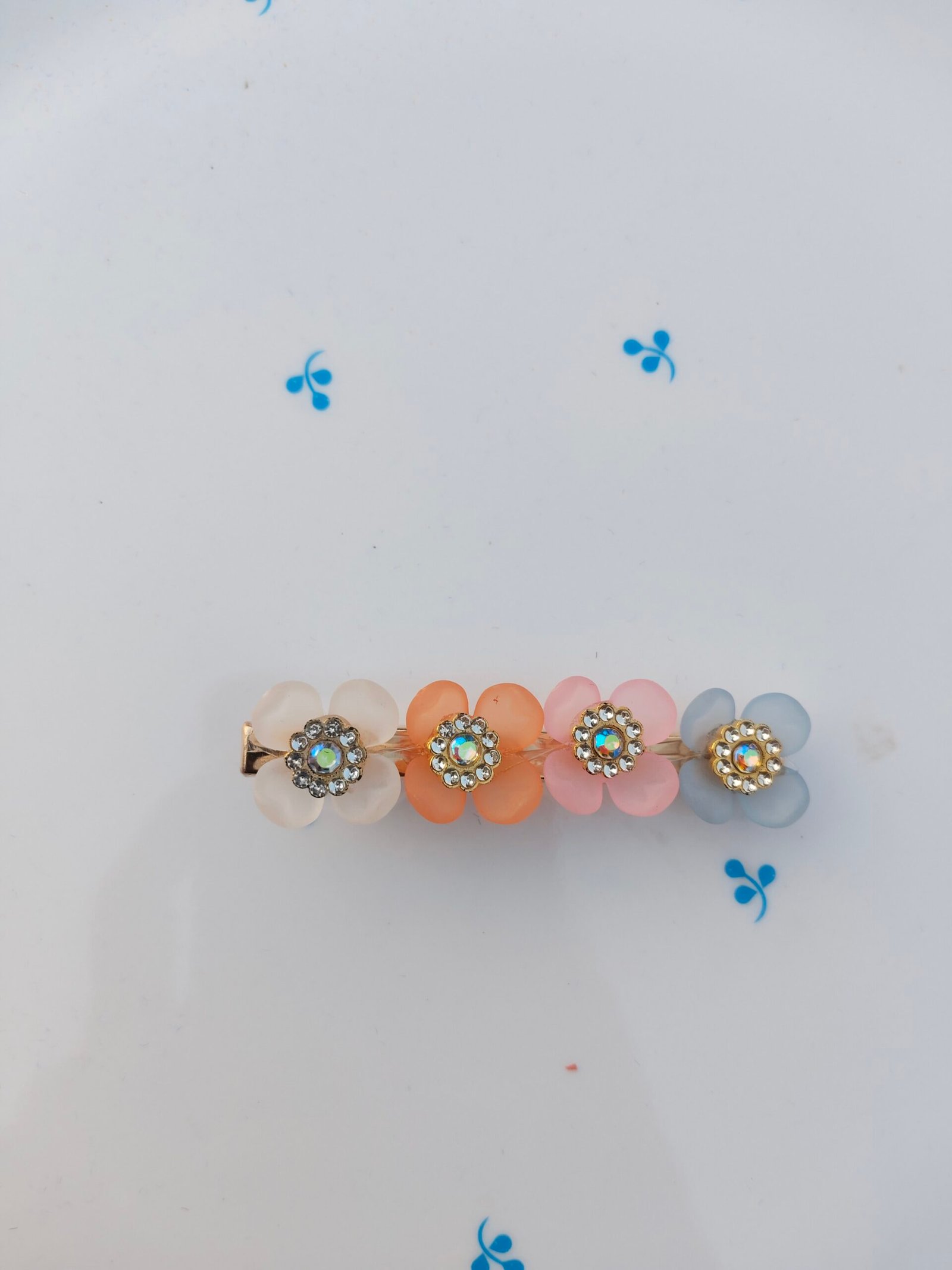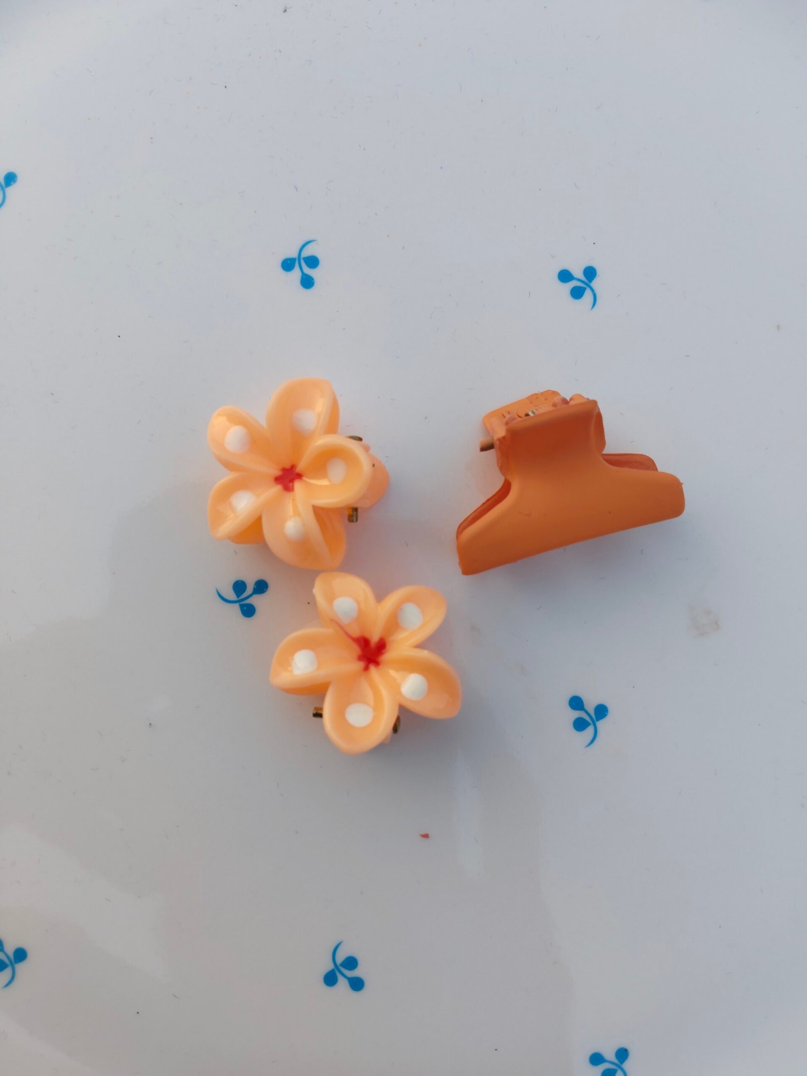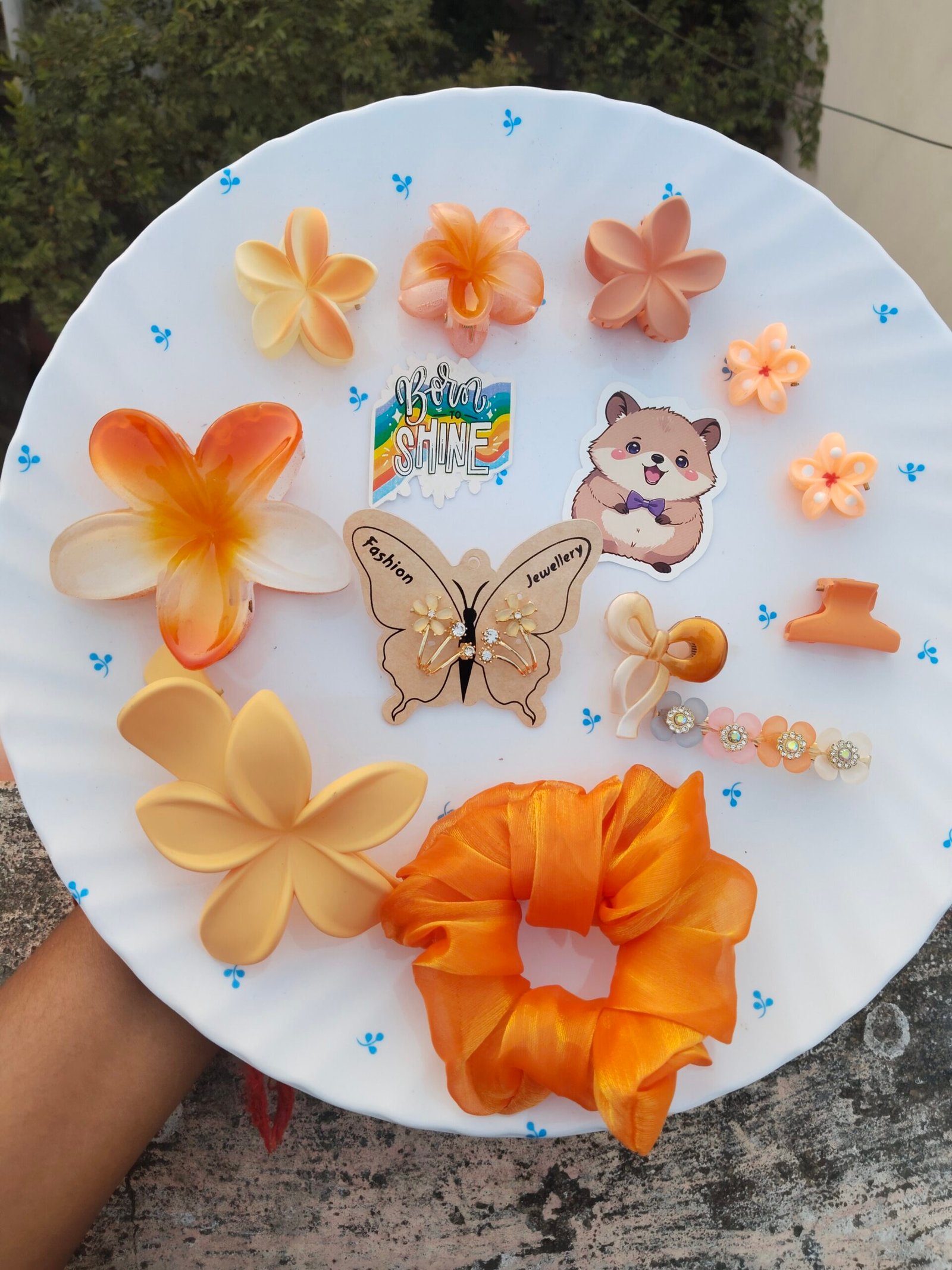 14 Items: Floral Clips: Big 1 Medium 3 Mini 2 , Side Clip 1, Designer Clip 1, Bow Clip 1, Scrunchie, Korean Earring, Korean Clip, Stickers 2